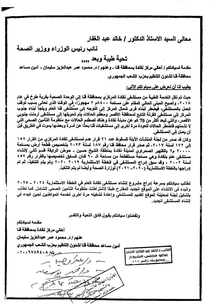 من جانبه، أوضح الدكتور/ محمود عمر عبدالعزيز سليمان، أمين تنظيم حزب الشعب الجمهوري بمحافظة قنا، أنه كان قد تم إصدار 21 قرار هدم لمستشفى نقادة المركزي من قبل لجنة المنشآت الآيلة للسقوط، بدءًا من القرار رقم 152 وحتى 172 لسنة 2017، ثم تلا ذلك قرار محافظ قنا رقم 187 لسنة 2023، الذي نص على تخصيص قطعة أرض بمساحة 20,000 متر مربع في الظهير الصحراوي لمدينة نقادة، بمنطقة "الشيخ حسين - حوض الرايقة، قسم ثاني"، لإنشاء مستشفى عام، هذه الأرض مستقطعة من المساحة الإجمالية التي تم تخصيصها بموجب القرار رقم 452 لسنة 2002، وأشار إلى أن المستشفى كان قد تم إدراجه في الخطة الاستثمارية لعامي 2019-2020 و2020-2021، لكن لم يتم التنفيذ في كلا العامين.