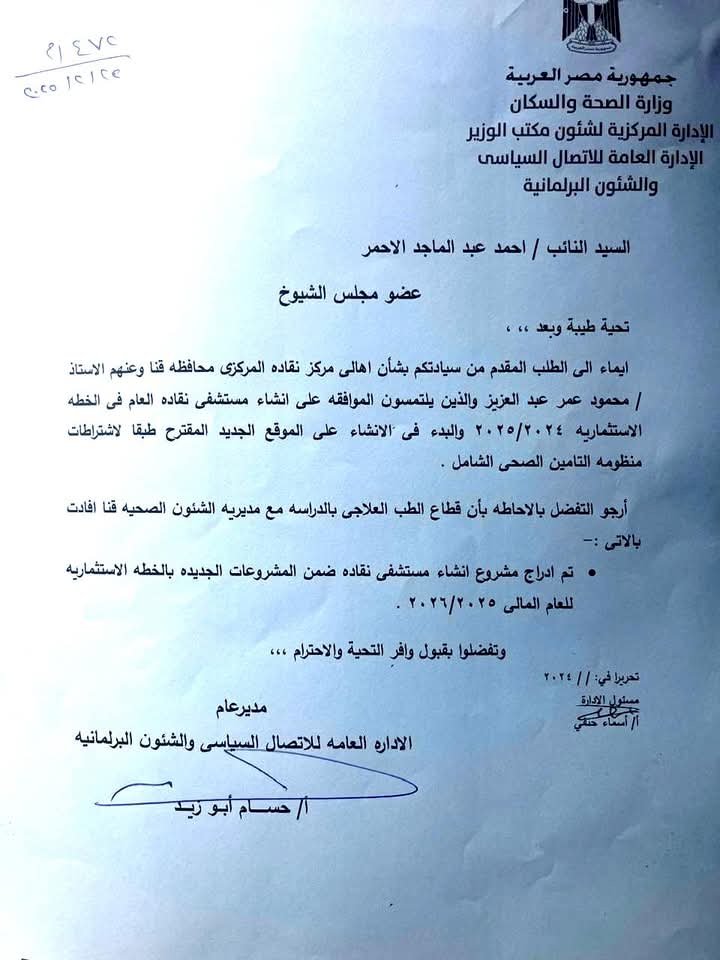 وقد جاء هذا القرار استجابة للطلب المقدم من النائب الدكتور/ أحمد عبدالماجد الأحمر، عضو مجلس الشيوخ وأمين حزب الشعب الجمهوري بمحافظة قنا، بالإضافة إلى جهود الدكتور/ محمود عمر عبدالعزيز سليمان، أمين تنظيم الحزب بالمحافظة، الذي تقدم بالطلب نيابة عن أهالي مركز نقادة وذلك بهدف معالجة النقص الحاد في الخدمات الصحية في نقادة.