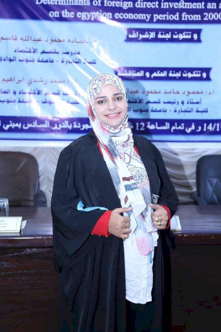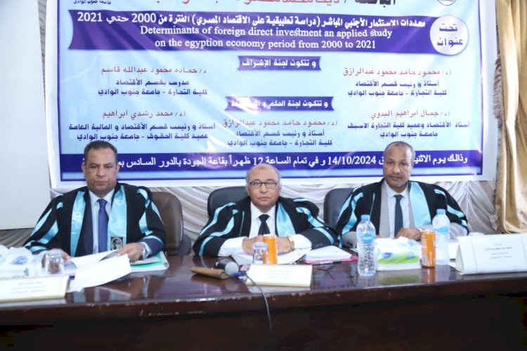 وتكونت لجنة الإشراف على الرسالة من الدكتور محمود حامد محمود عبد الرزاق، أستاذ ورئيس قسم الاقتصاد بكلية التجارة جامعة جنوب الوادي، والدكتور حماده محمود عبدالله قاسم، المدرس بقسم الاقتصاد بكلية التجارة جامعة جنوب الوادي.