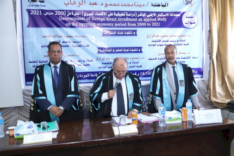 عقدت المناقشة في رحاب جامعة جنوب الوادي برعاية الدكتور أحمد عكاوي، رئيس الجامعة، والدكتور علاء تاج الدين، وكيل كلية التجارة لشئون الدراسات العليا والبحوث، والدكتور محمود حامد محمود عبد الرزاق رئيس قسم الاقتصاد بالكلية.