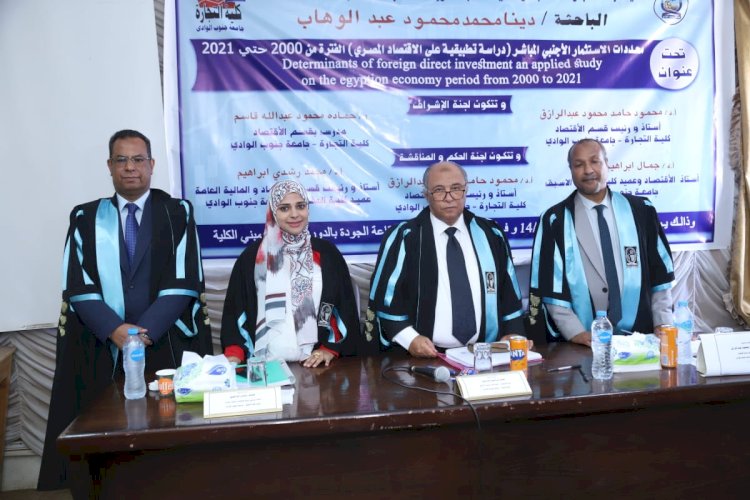 حصلت الباحثة دينا محمد محمود عبد الوهاب، على درجة الماجستير فى الاقتصاد من كلية التجارة بجامعة جنوب الوادي بقنا، عن موضوع رسالتها المعنونة: " محددات الاستثمار الأجنبي المباشر (دراسة تطبيقية على الاقتصاد المصري ) الفترة من ٢٠٠٠ الى ٢٠٢١".