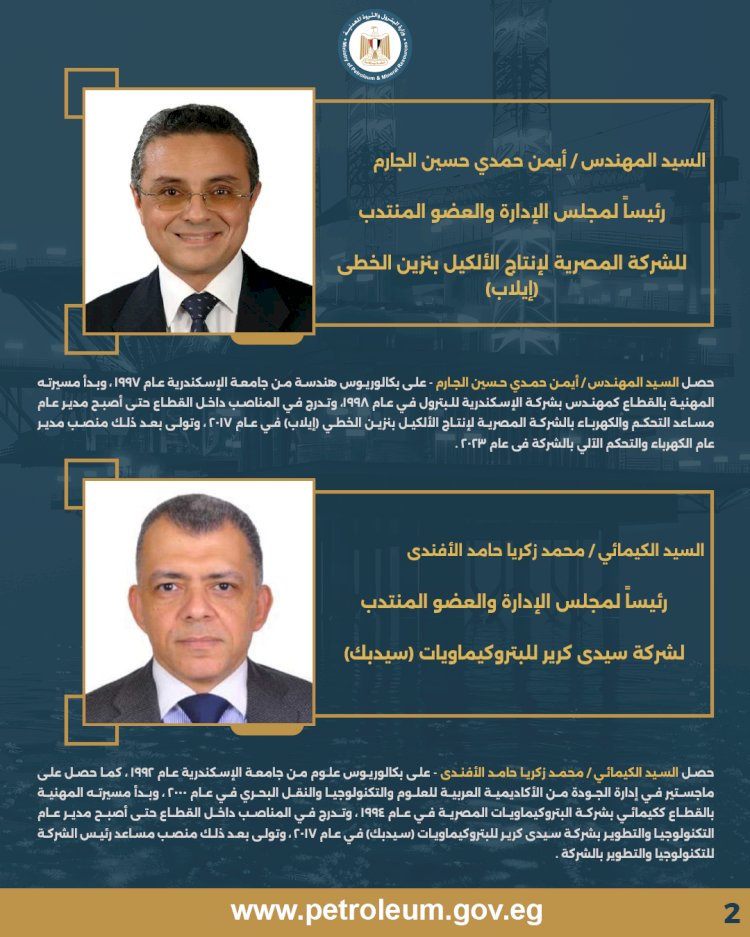 في إطار حرص الوزارة علي دعم المواقع القيادية بالكفاءات والخبرات المتميزة ، وضخ دماء جديدة لتطوير الأداء ،أصدر المهندس كريم بدوي وزير البترول والثروة المعدنية حركة تنقلات وتكليفات لرؤساء شركات البتروكيماويات، شملت تعيين رئيس جديد للشركة المصرية القابضة للبتروكيماويات، وتعيين رئيسي شركتي سيدي كرير للبتروكيماويات وإيلاب