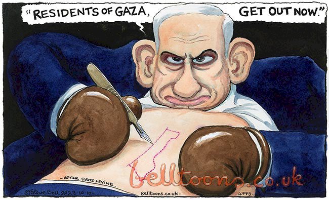 ويظهر رئيس الوزراء الإسرائيلي بقفازات الملاكمة ويحمل مشرطا على بطنه محددا عليه خريطة لغزة مع تعليق: يا سكان غزة، اخرجوا الآن