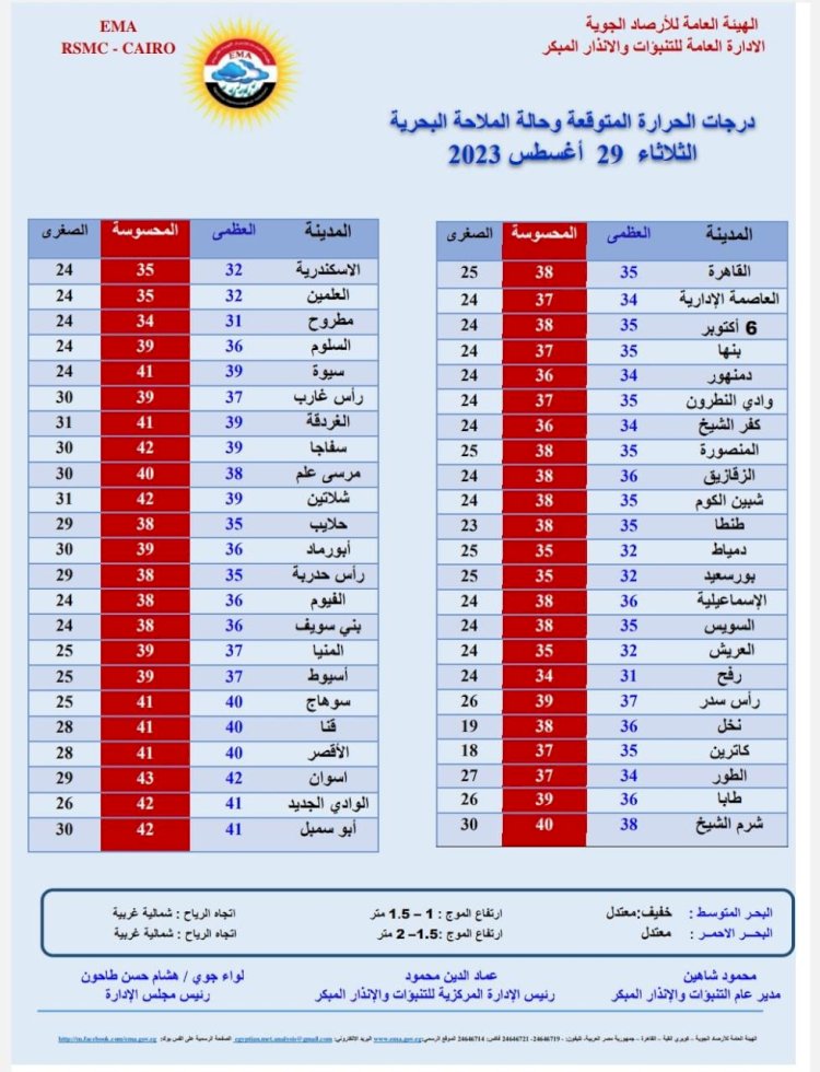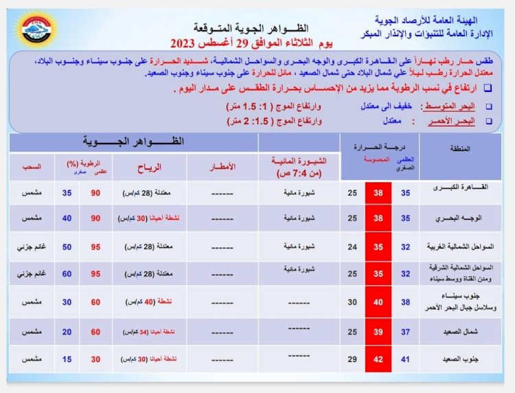 وبالنسبة لدرجات الحرارة، اليوم الثلاثاء: القاهرة العظمى 35 درجة والمحسوسة 38 درجة والصغرى 25 درجة، والإسكندرية العظمى 32 والصغرى 24 درجة، ومطروح العظمى 31 درجة والصغرى 24 درجة، وسوهاج العظمى 40 درجة والصغرى 25 درجة، وقنا العظمى 40 درجة والصغرى 28 درجة، وأسوان العظمى 42 درجة والمحسوسة 43 والصغرى 29 درجة
