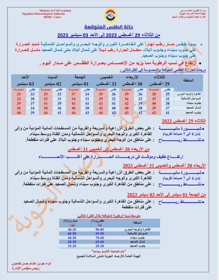 كما تتوقع هيئة الأرصاد أن يشهد اليوم ارتفاعا فى نسب الرطوبة على مدار اليوم يزيد من الإحساس بحرارة الطقس، ونشاط رياح ببعض المناطق مما يساعد على تلطيف الأجواء، وشبورة مائية صباحا من الساعة 4 : 7 صباحا على بعض الطرق المؤدية من وإلى القاهرة الكبرى والوجه البحرى والسواحل الشمالية ومدن القناة ووسط سيناء وشمال الصعيد.