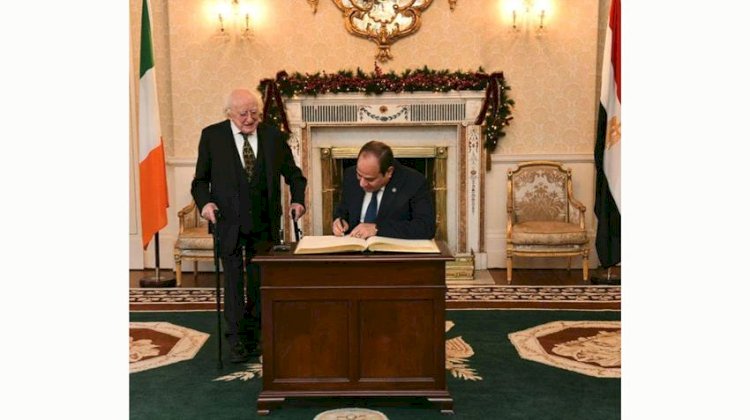 وصرح المتحدث الرسمي باِسم رئاسة الجمهورية أن السيد الرئيس قد قام عقب الوصول لمقر الإقامة الرسمي لرئيس أيرلندا، بالتوقيع في السجل التاريخي لزيارات كبار الشخصيات، ثم تلا ذلك عقد لقاء بين الجانبين، أكد فيه السيد الرئيس ضرورة مواصلة العمل لتعزيز العلاقات الثنائية بين مصر وأيرلندا في كافة المجالات ذات الاهتمام المشترك، والسعي لزيادة حجم التبادل التجاري والاستثمارات بين البلدين من خلال العمل على تنظيم زيارات لبعثات تجارية بين الدولتين، وزيادة انخراط الشركات الأيرلندية في السوق المصري الذي يوفر فرصًا وتسهيلات كبيرة في مختلف القطاعات، حيث تم في هذا الصدد استعراض الإجراءات التي اتخذتها مصر لتحقيق الإصلاح الاقتصادي والتنمية الشاملة وجذب الاستثمارات الأجنبية.