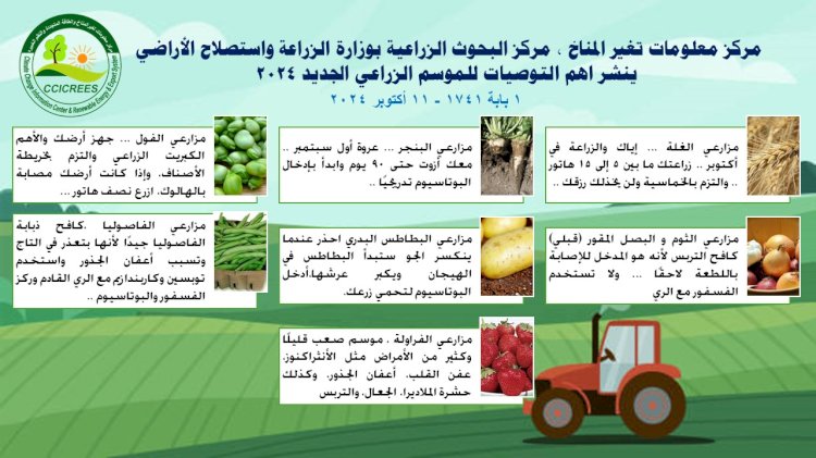 نشرت وزارة الزراعة واستصلاح الأراضي، ممثلة في مركز معلومات تغير المناخ بمركز البحوث الزراعية، إطلاق أهم التوصيات والإرشادات للموسم الزراعي الجديد لعام 2024.