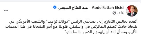 وكتب الرئيس السيسي على صفحته بموقع التواصل الاجتماعي فيسبوك: " أتقدم بخالص التعازي إلى صديقي الرئيس "دونالد ترامب" والشعب الأمريكي في ضحايا حادث تحطم الطائرتين في واشنطن. قلوبنا مع أسر الضحايا في هذا المصاب الأليم. ونسأل الله أن يلهمهم الصبر والسلوان."