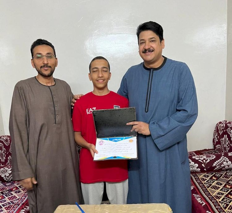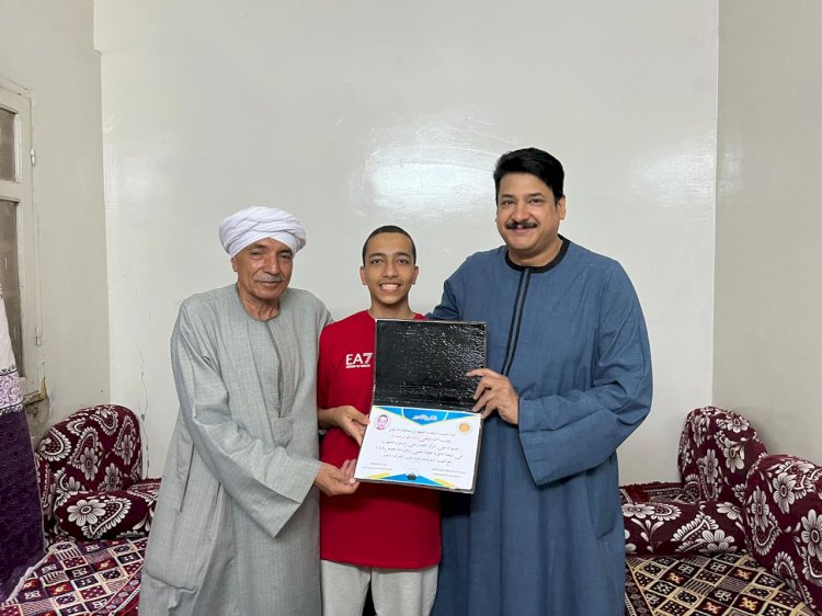 كرم الدكتور/ محمود عمر عبدالعزيز سليمان، أمين مساعد محافظة قنا لشئون التنظيم بحزب الشعب الجمهوري، الطالب أحمد فتحي عبدالقوي عبدربه، بمدرسة طوخ الثانوية المشتركة بمركز نقادة، ومنحه شهادة تقدير مقدمة من الحزب، بمنزل الطالب وبحضور أسرته، وذلك لحصوله على المركز الخامس على مستوى الجمهورية في نتيجة الثانوية العامة للعام الدراسي 2023 – 2024 شعبة ( علمي - رياضة ) بمجموع 404.5 درجة.