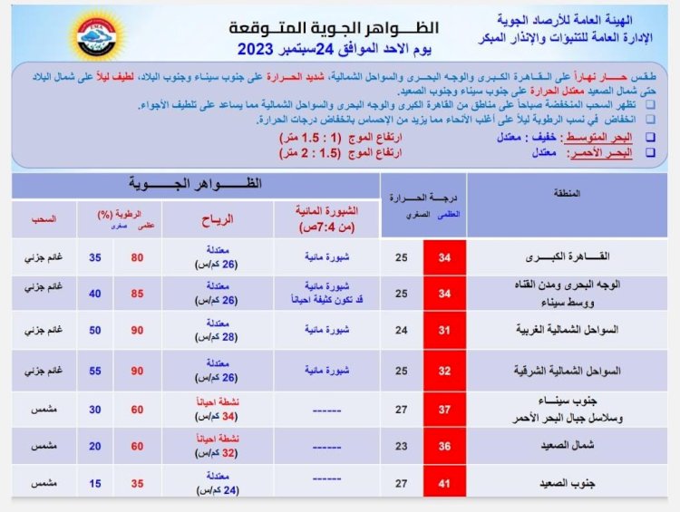 قالت هيئة الأرصاد الجوية إنها تتوقع أن يشهد اليوم الأحد 24 سبتمبر 2023 طقسا حارا نهارا على القاهرة الكبرى والوجه البحرى و السواحل الشمالية، شديد الحرارة على جنوب سيناء وجنوب الصعيد ، لطيف ليلا على شمال البلاد حتى شمال الصعيد ، معتدل على جنوب سيناء وجنوب الصعيد
