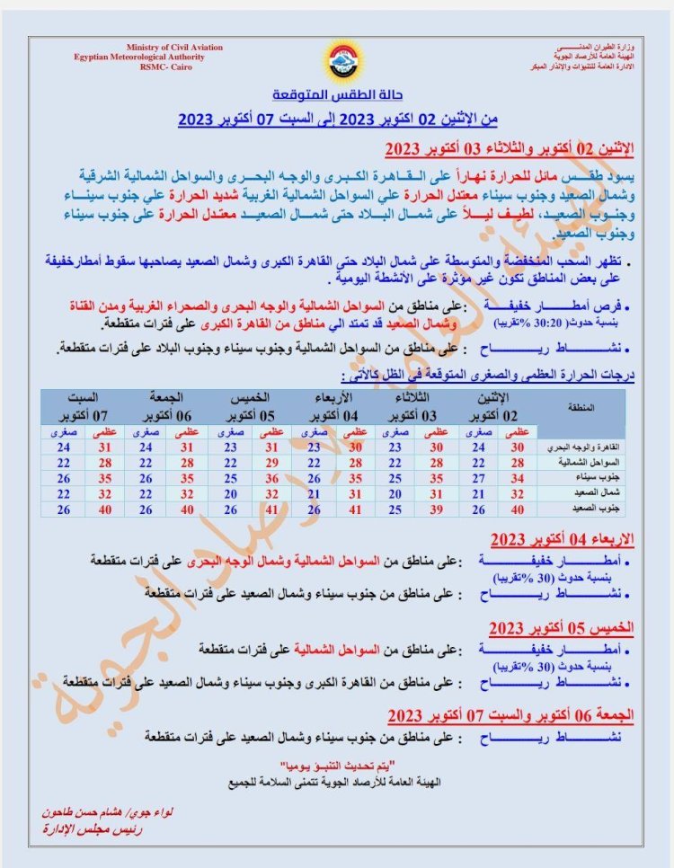 قالت هيئة الأرصاد الجوية إنها تتوقع أن يسود اليوم الإثنين، طقس مائل للحرارة نهاراً على القاهرة الكبرى والوجه البحري والسواحل الشمالية الشرقية وجنوب سيناء وشمال الصعيد، معتدل على السواحل الشمالية الغربية، شديد الحرارة على جنوب الصعيد، لطيف ليلاً على شمال البلاد حتى شمال الصعيد، معتدل الحرارة على جنوب سيناء وجنوب الصعيد.