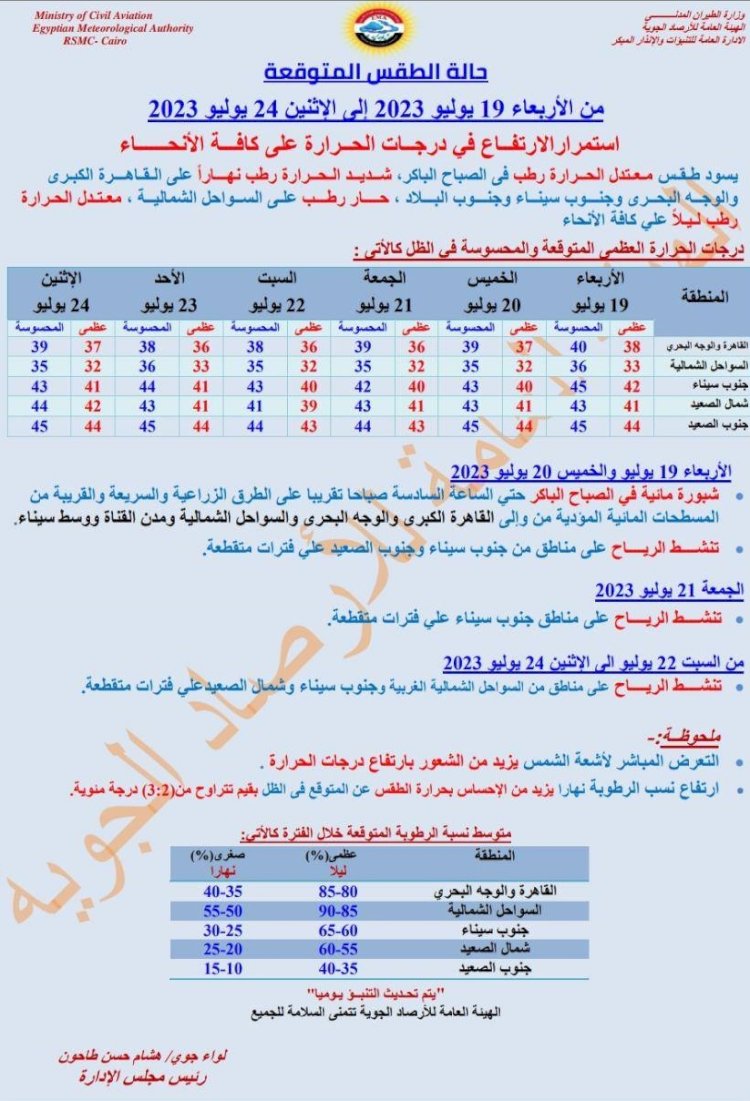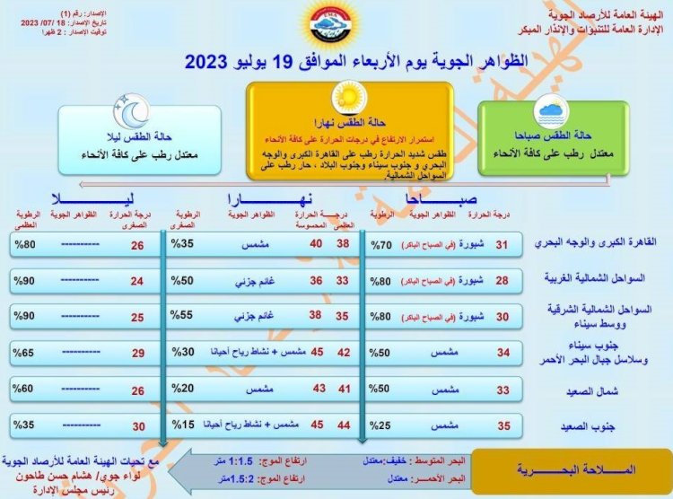 درجات الحرارة المتوقعة اليوم الأربعاء الموافق 19 يوليو 2023: