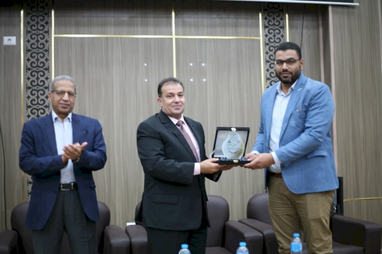 وقام الدكتور / محمود الشاذلي عميد الكلية بتسليم دروع التكريم لرئيس الجامعة، ونائب رئيس الجامعة لشئون التعليم والطلاب