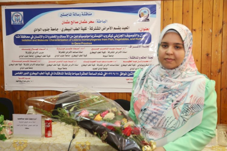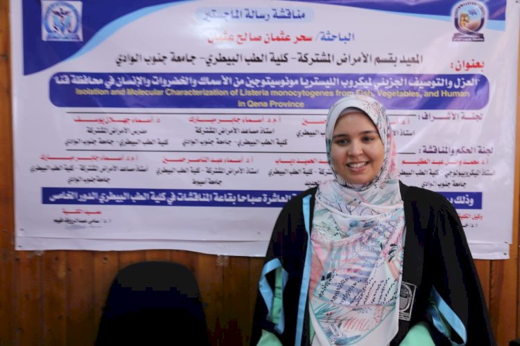 حصلت الباحثة سحر عثمان صالح عثمان، المعيدة بقسم الأمراض المشتركة بكلية الطب البيطري بجامعة جنوب الوادي بقنا، على درجة الماجستير في العلوم الطبية البيطرية من قسم الأمراض المشتركة بكلية الطب البيطري بقنا، عن رسالتها المعنونة: "العزل والتوصيف الجزيئي لميكروب الليستريا مونوسيتوجين من الأسماك والخضروات والإنسان في محافظة قنا".