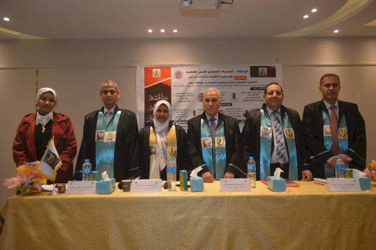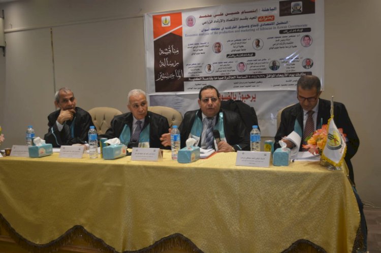 نوقشت بكلية الزراعة بجامعة جنوب الوادي بقنا، رسالة الماجستير للباحثة /ابتسام حسين على محمد، المعيدة بقسم الاقتصاد والإرشاد الزراعي، بعنوان "التحليل الاقتصادي لإنتاج وتسويق الكركديه في محافظة أسوان" وذلك تحت رعاية الأستاذ الدكتور أحمد عكاوي رئيس الجامعة، والأستاذ الدكتور محمد وائل عبد العظيم محمد نائب رئيس الجامعة لشئون الدراسات العليا والبحوث، والأستاذ الدكتور عصام الدين عبد الهادي عميد الكلية، والأستاذ الدكتور عبد الحليم أحمد حمدي وكيل الكلية لشئون الدراسات العليا والبحوث، والأستاذ الدكتور منتصر محمد محمود حمدون رئيس قسم الاقتصاد والإرشاد الزراعي.