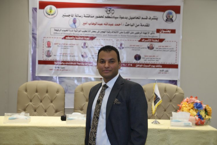 حصل الباحث أحمد عبدالله عبد الوهاب أمير، على درجة الماجستير فى العلوم الزراعية محاصيل "تربية نبات" من كلية الزراعة جامعة جنوب الوادي بقنا، وذلك عن موضوع رسالته المعنونة: "تأثير الاجهاد الرطوبى على القدرة على الائتلاف وقوة الهجين في بعض التراكيب الوراثية لذرة الحبوب الرفيعة".