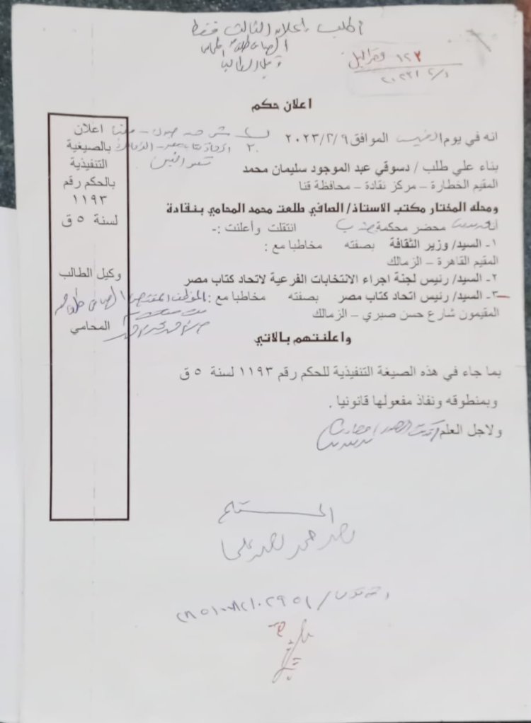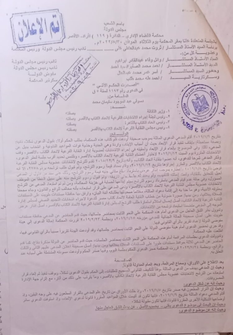 الاستاذ علاء عبد الهادى رئيس النقابة العامة لاتحاد كتاب مصر يقرر للمرة الثانية استبعاد الشاعر والباحث فى الموروث الشعبي دسوقى الخطارى من سباق انتخابات مجلس إدارة النقابة الفرعية لاتحاد الكتاب بالاقصر رغم حصول الأخير على حكم قضائي بإلغاء هذا القرار فى الدعوى رقم ١١٩٣ لسنة ٥ ق من محكمة القضاء الإداري بالاقصر و رغم إعلانه رسميا بهذا الحكم هو والاستاذ محمد جاد المولى الرئيس الحالى للنقابة الفرعية لاتحاد الكتاب بالاقصر بالصورة التنفيذية من هذا الحكم إلا أنه ضرب به عرض الحائط و قرر استبعاده من الترشح للانتخابات على مقعد الرئيس متناسي أو متجاهل الحكم الذى بين يدى المرشح لما يتمتع به من سيرة طيبة بين زملائه فى الوسط الادبى ولانعرف السبب هل خوف الرئيس الحالى من خسارة المنافسة بعدما تأكد للجميع محاولاته عدم الإعلان عنها حتى نهاية اليوم الأول من فتح باب الترشح والتعتيم المقصود على خلاف ما فعل رؤساء النقابات الفرعية الأخرى الذين قاموا بالاعلان عنها منذ اسبوع مضى مما دفع الخطارى إلى تحرير محضر بالواقعة يتهم فيه الاخير بعدم تنفيذ حكم قضائى واجب النفاذ