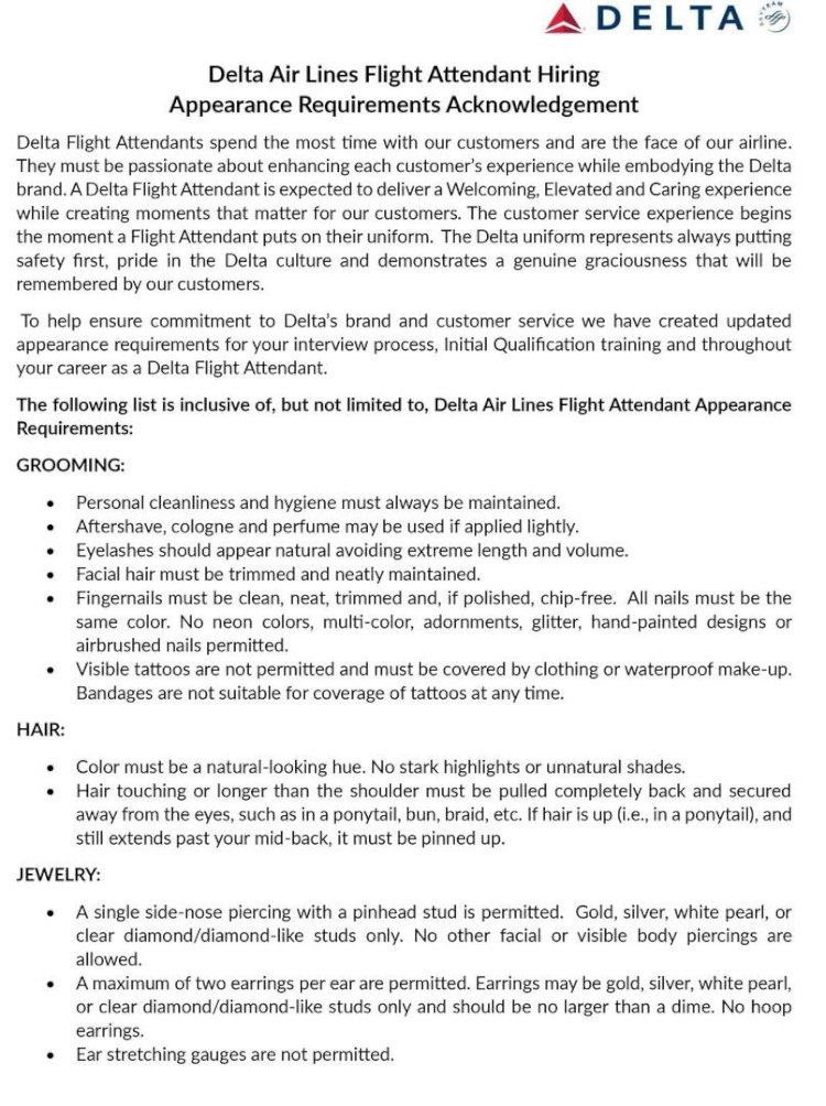 الوثيقة نصت : يقضي مضيفو طيران دلتا معظم الوقت مع عملائنا وهم واجهة شركة الطيران الخاصة بنا. وتبدأ تجربة خدمة العملاء في اللحظة التي يرتدي فيها مضيف الطيران زيه الرسمي الخاص بالشركة