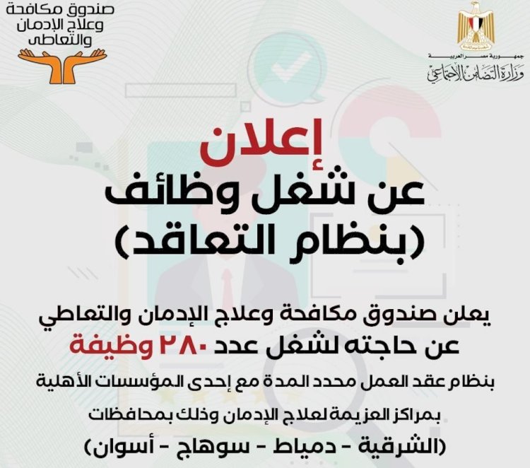 قام صندوق مكافحة وعلاج الإدمان والتعاطي التابع لوزيرة التضامن الاجتماعي فى الأعلان عن حاجته لشغل عدد 280 وظيفة بنظام عقود العمل محددة المدة مع إحدى المؤسسات الأهلية بمراكز العزيمة لعلاج الإدمان الجديدة وذلك بالمحافظات الآتية "الشرقية – دمياط – سوهاج – أسوان " ويستمر تلقي الطلبات لشغل الوظيفة حتى يوم 10 أغسطس المقبل