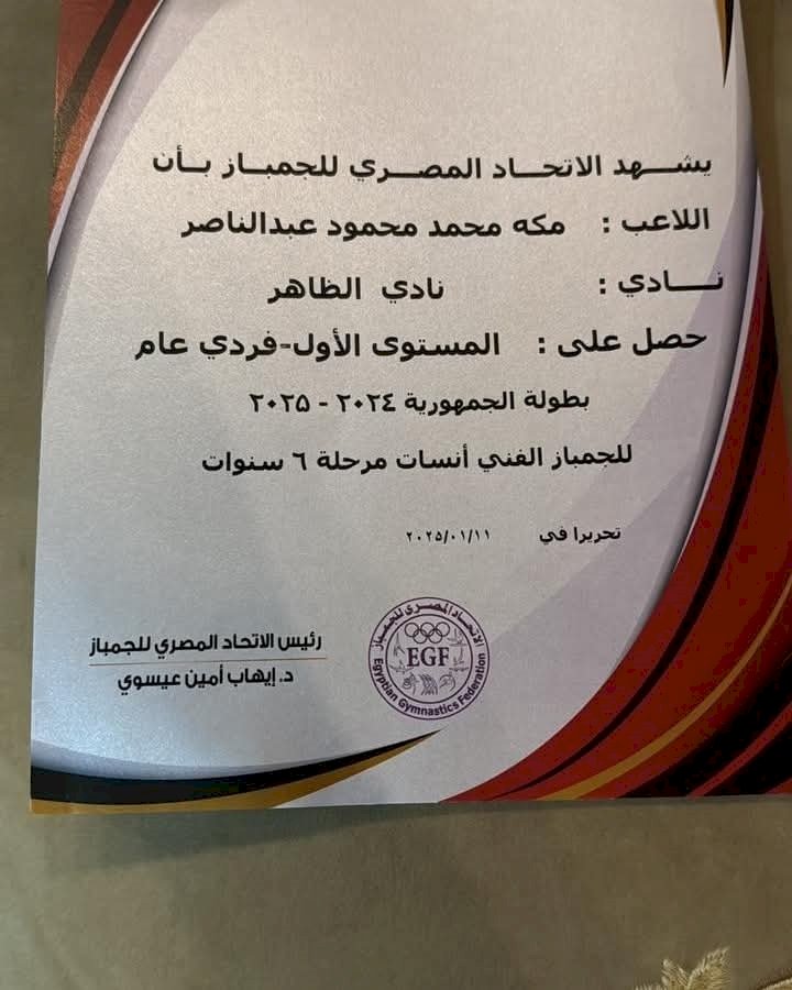 حيث أسفرت بطولة الاتحاد المصري للجمباز التي أقيمت بنادي الظاهر بحصول طالبة المنيا على المستوى الأول فردي عام والميدالية الذهبية ببطولة الجمهورية ٢٠٢٤/٢٠.للجمباز الفني آنسات مرحلة ٦ سنوات.