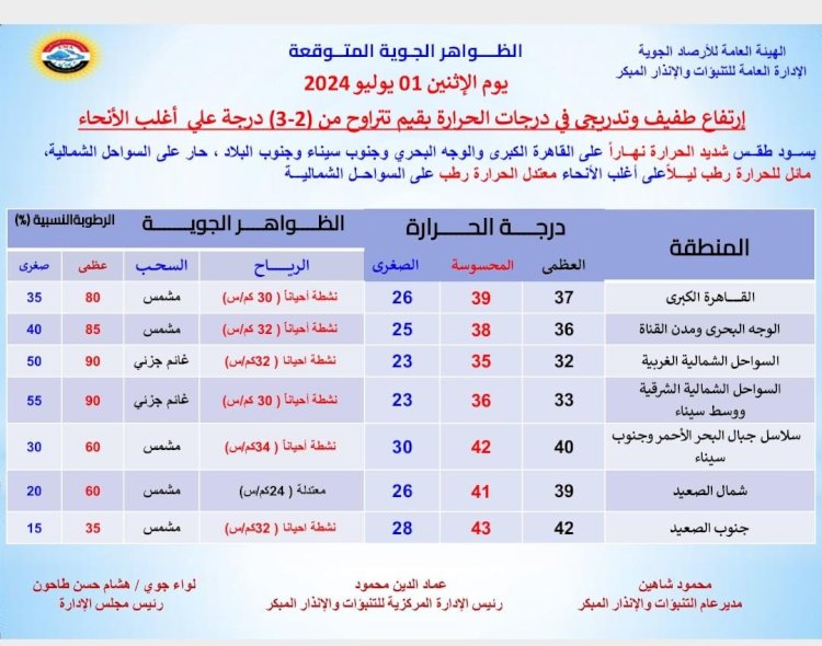قالت هيئة الأرصاد الجوية إنها تتوقع أن يشهد اليوم الإثنين ارتفاعا طفيفا وتدريجيا فى درجات الحرارة بقيم تتراوح من 2: 3 درجات على شمال البلاد حتى شمال الصعيد.