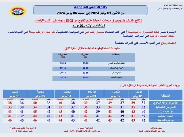 ومتوقع كذلك أن يسود طقس شديد الحرارة رطب نهارا على القاهرة الكبرى والوجه البحرى وجنوب سيناء وجنوب البلاد ، حار على السواحل الشمالية، مائل للحرارة رطب ليلاً على أغلب الأنحاء، معتدل الحرارة رطب على السواحل الشمالية.