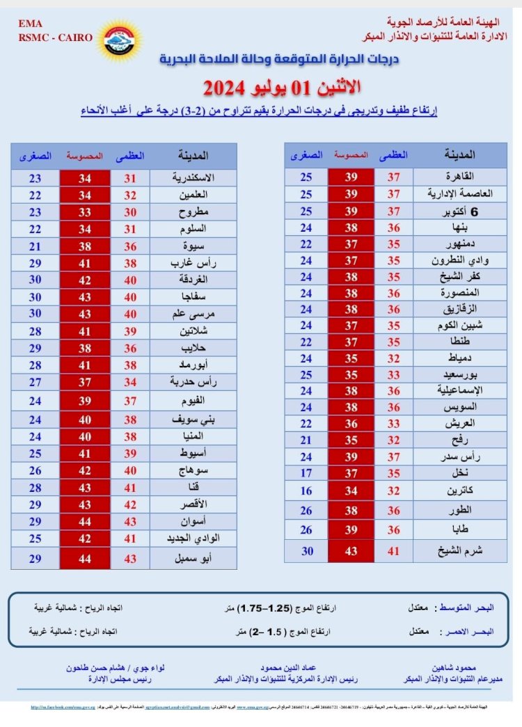 درجات الحرارة اليوم الإثنين 1 يوليو 2024 : القاهرة العظمى 37 درجة والصغرى 25، والإسكندرية العظمى 31 والصغرى 23، ومطروح العظمى 30 درجة والصغرى 23، وسوهاج العظمى 40 درجة والصغرى 26، وقنا العظمى 41 درجة والصغرى 28، وأسوان العظمى 43 درجة والصغرى 29.
