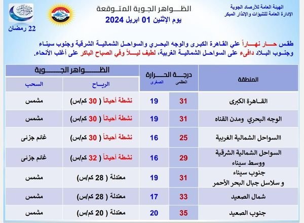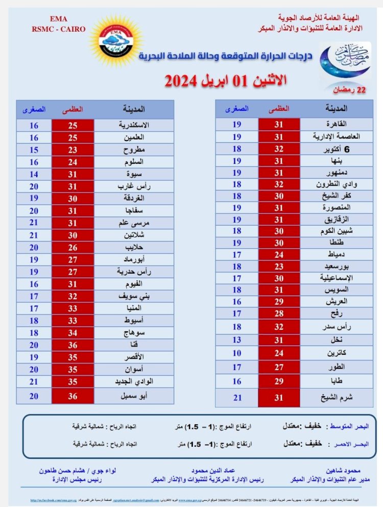 وبالنسبة لدرجات الحرارة اليوم الإثنين 1 إبريل 2024: القاهرة العظمى 31 درجة والصغرى 19، والإسكندرية العظمى 25 والصغرى 16، ومطروح العظمى 23 درجة والصغرى 15، وسوهاج العظمى 34 درجة والصغرى 18، وقنا العظمى 36 درجة والصغرى 20، وأسوان العظمى 35 درجة والصغرى 20.