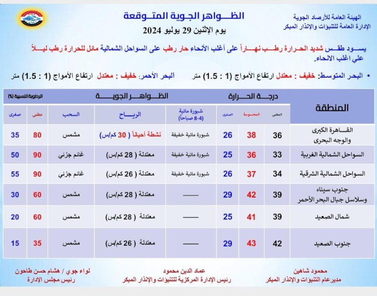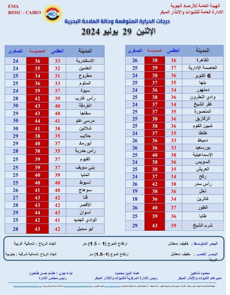 درجات الحرارة اليوم الإثنين 29 يوليو 2024: القاهرة العظمى 36 درجة والصغرى 26، والإسكندرية العظمى 33 والصغرى 24، ومطروح العظمى 31 درجة والصغرى 25، وسوهاج العظمى 40 درجة والصغرى 26، وقنا العظمى 42 درجة والصغرى 27، وأسوان العظمى 43 درجة والصغرى 29.