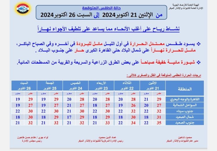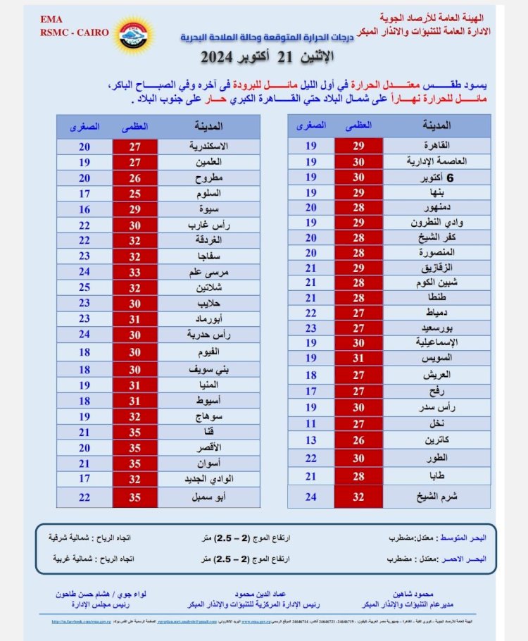 درجات الحرارة المتوقعة اليوم الإثنين 21 أكتوبر 2024: القاهرة العظمى 29 درجة والصغرى 19، والإسكندرية العظمى 27 والصغرى 20، ومطروح العظمى 26 درجة والصغرى 20، وسوهاج العظمى 32 درجة، والصغرى 19، وقنا العظمى 35 درجة والصغرى 21، وأسوان العظمى 35 درجة والصغرى 21.