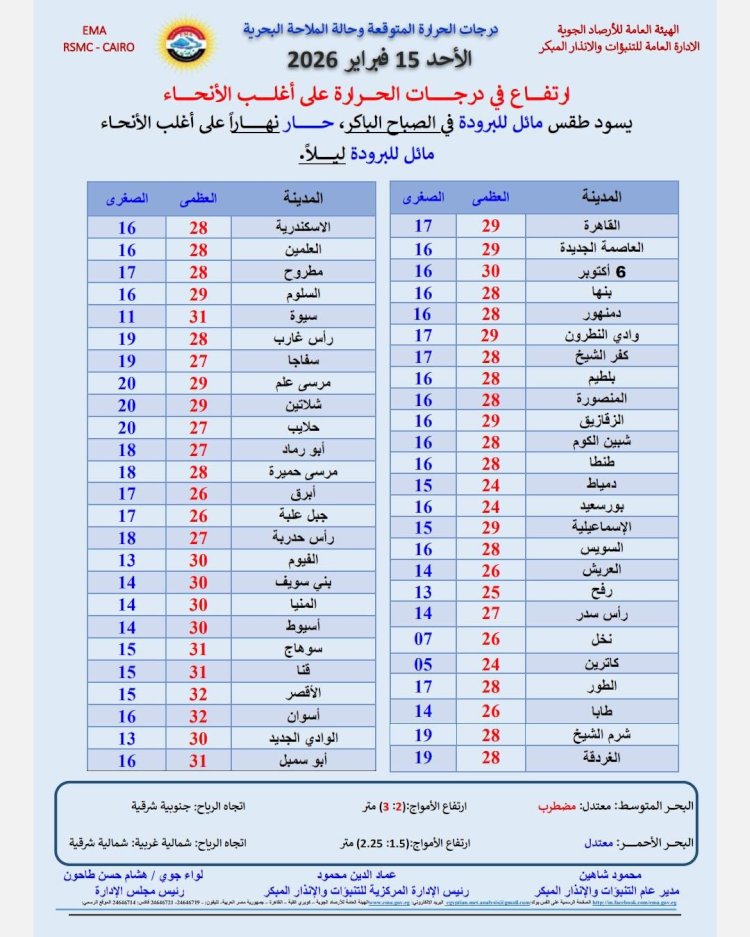 درجات الحرارة اليوم الأحد 15 فبراير 2026:القاهرة العظمى 29 درجة والصغرى 17 درجة. الإسكندرية العظمى 28 درجة والصغرى 16 درجة. مطروح العظمى 28 درجة والصغرى 17 درجة. سوهاج العظمى 31 درجة والصغرى 15 درجة. قنا العظمى 31 درجة والصغرى 15 درجة. فى أسوان العظمى 32 درجة والصغرى 16 درجة.