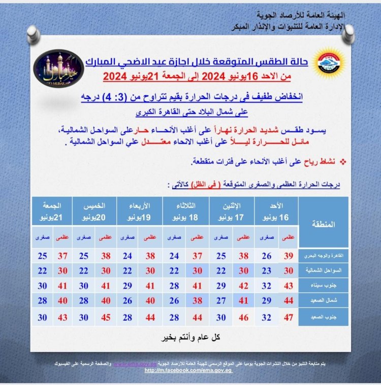 قالت هيئة الأرصاد الجوية إنها تتوقع أن يشهد اليوم الأحد ، انخفاضا فى درجات الحرارة بقيم تتراوح من 3: 4 درجة على شمال البلاد حتى القاهرة الكبرى، ليسود طقس شديد الحرارة نهارا على أغلب الأنحاء حار على السواحل الشمالية ، مائل للحرارة ليلا على أغلب الأنحاء معتدل على السواحل الشمالية.