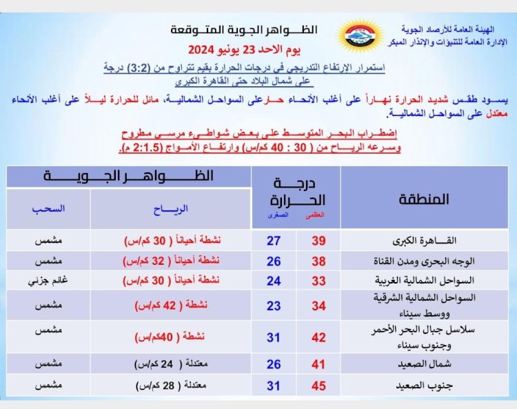 درجات الحرارة اليوم الأحد 23 يونيو 2024: القاهرة العظمى 39 درجة والصغرى 27، والإسكندرية العظمى 33 والصغرى 24، ومطروح العظمى 31 درجة والصغرى 23، وسوهاج العظمى 43 درجة والصغرى 27، وقنا العظمى 44 درجة والصغرى 29، وأسوان العظمى 45 درجة والصغرى 31.