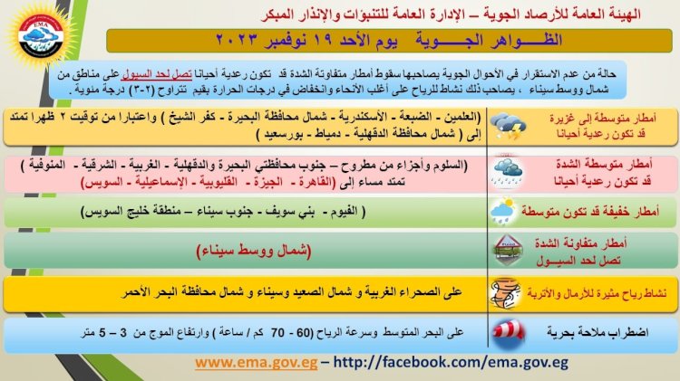 كما يشهد اليوم أمطار متوسطة الشدة قد تكون رعدية أحيانا على السلوم وأجزاء من مطروح - جنوب محافظتي البحيرة والدقهلية - الغربية - الشرقية - المنوفية) تمتد مساء إلى القاهرة - الجيزة - القليوبية - الإسماعيلية - السويس)، وأمطار خفيفة قد تكون متوسطة على (الفيوم - بني سويف - جنوب سيناء - منطقة خليج السويس)، وأمطار متفاونة الشدة تصل لحد السيول شمال ووسط سيناء).