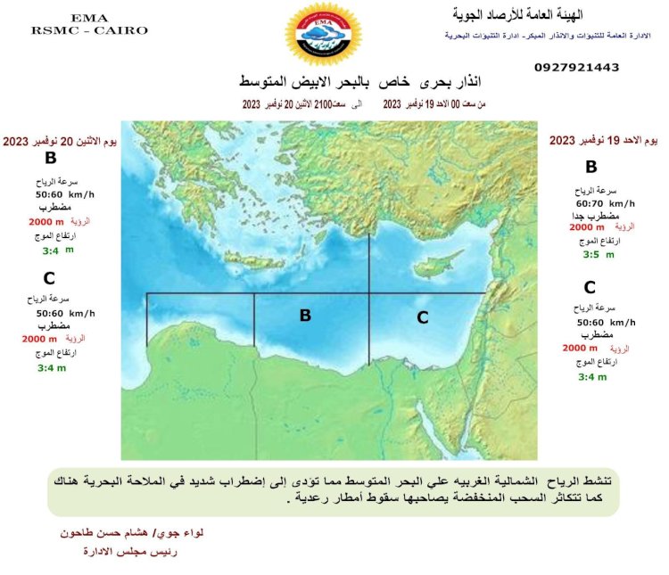كما يشهد اليوم نشاط رياح مثيرة للأرمال والأتربة على الصحراء الغربية و شمال الصعيد وسيناء و شمال محافظة البحر الأحمر، واضطراب ملاحة بحرية على البحر المتوسط وسرعة الرياح (60 - 70 كم / ساعة ( وارتفاع الموج من 3 - 5 أمتار).