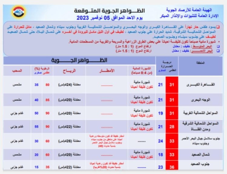 قالت هيئة الأرصاد الجوية إنها تتوقع أن يشهد اليوم الأحد، طقس حار نهاراً على القاهرة الكبرى والوجه البحرى والسواحل الشمالية الغربية وجنوب سيناء وشمال الصعيد، مائل الحرارة على السواحل الشمالية الشرقية، شديد الحرارة على جنوب الصعيد، لطيف فى أول الليل مائل للبرودة فى آخره على شمال البلاد حتى شمال الصعيد، لطيف على جنوب سيناء وجنوب الصعيد.