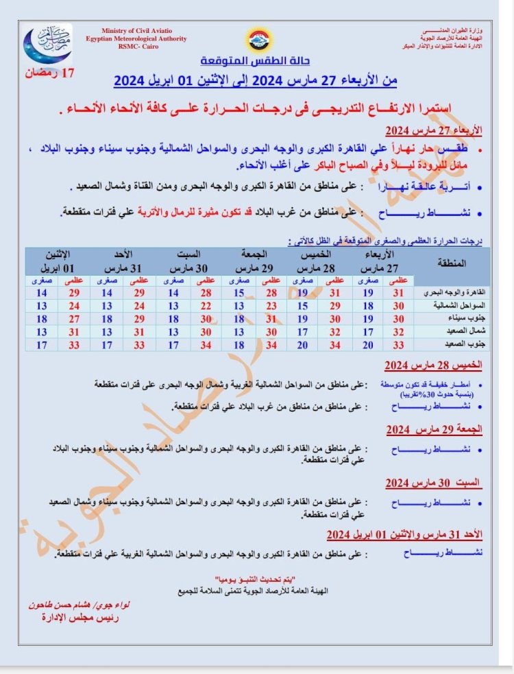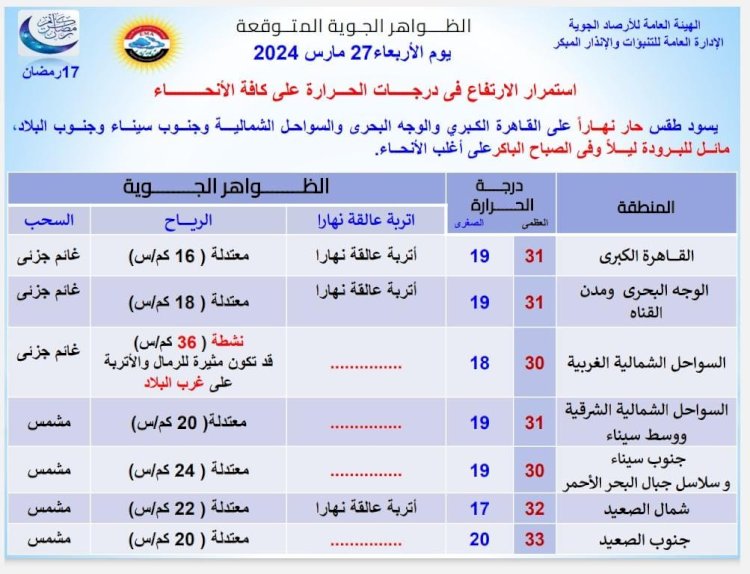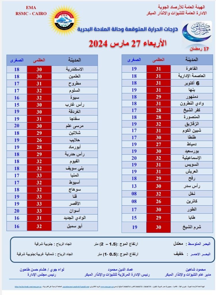 وبالنسبة لدرجات الحرارة اليوم الأربعاء 27 مارس 2024: القاهرة العظمى 31 درجة والصغرى 19، والإسكندرية العظمى 30 والصغرى 18، ومطروح العظمى 31 درجة والصغرى 17، وسوهاج العظمى 32 درجة والصغرى 18، وقنا العظمى 33 درجة والصغرى 19، وأسوان العظمى 33 درجة والصغرى 20.