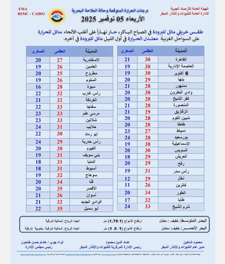 درجات الحرارة اليوم الأربعاء 5 نوفمبر 2025 : القاهرة العظمى 30 درجة والصغرى 21 درجة. الإسكندرية العظمى 27 درجة والصغرى 20 درجة. مطروح العظمى 25 درجة والصغرى 20 درجة.سوهاج العظمى 32 درجة والصغرى 19 درجة. قنا العظمى 34 درجة والصغرى 20 درجة. أسوان العظمى 36 درجة والصغرى 21 درجة.