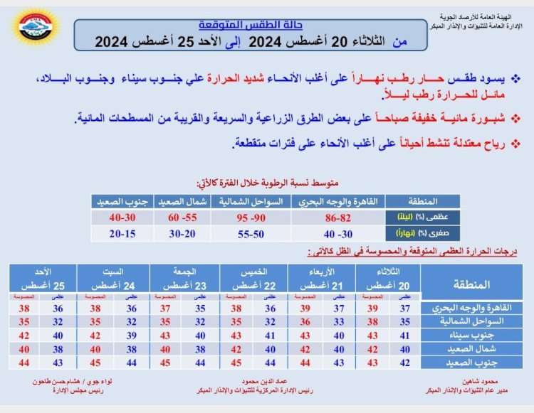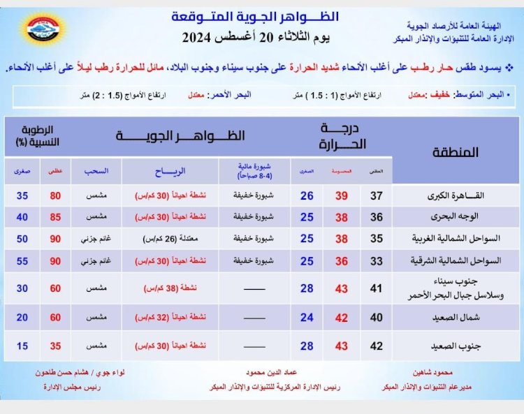 درجات الحرارة اليوم الثلاثاء 20 أغسطس 2024: القاهرة العظمى 37 درجة والصغرى 26، والإسكندرية العظمى 35 والصغرى 25، ومطروح العظمى 34 درجة والصغرى 25، وسوهاج العظمى 40 درجة والصغرى 26، وقنا العظمى 41 درجة والصغرى 27، وأسوان العظمى 43 درجة والصغرى 29 درجة.