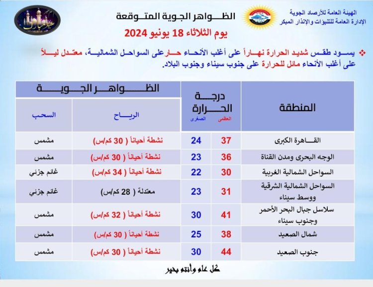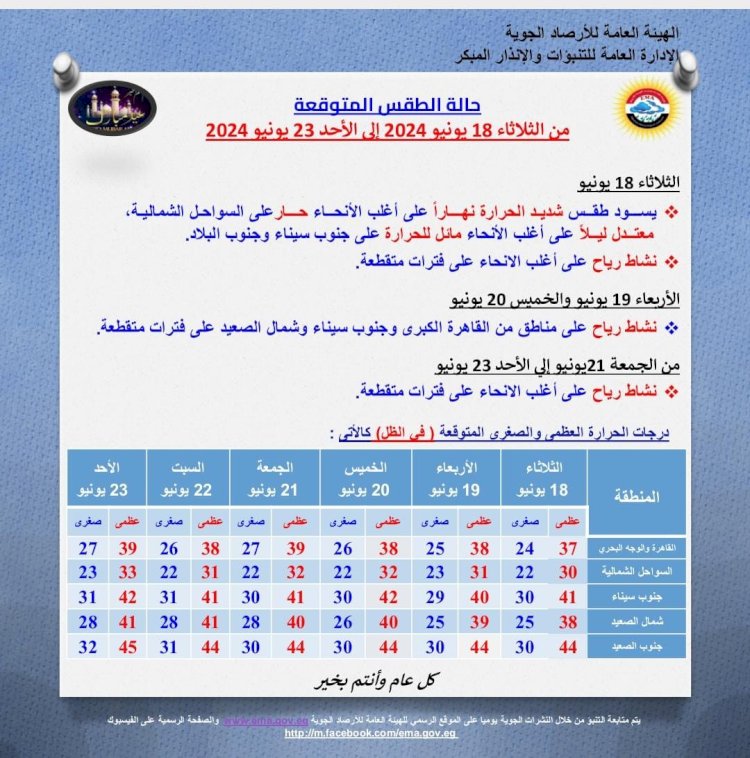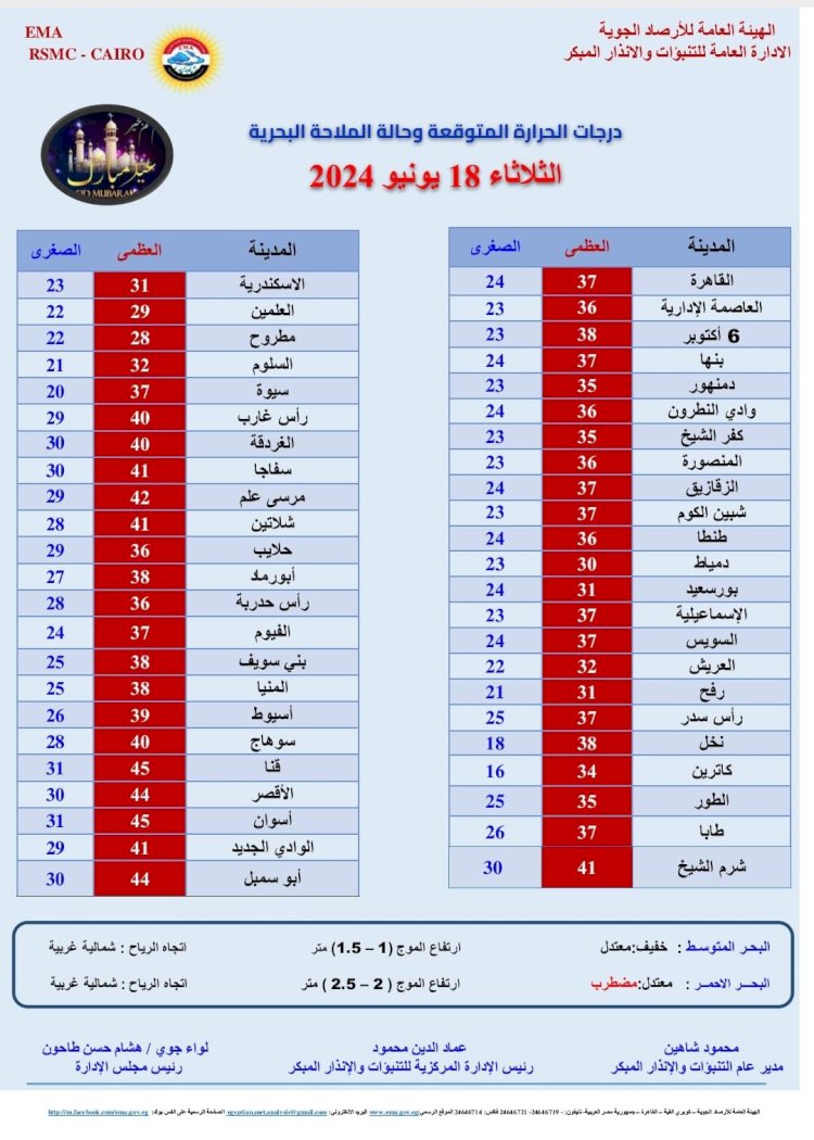 درجات الحرارة الثلاثاء 18 يونيو 2024: القاهرة العظمى 37 درجة والصغرى 24، والإسكندرية العظمى 31 والصغرى 23، ومطروح العظمى 28 درجة والصغرى 22، وسوهاج العظمى 40 درجة والصغرى 28، وقنا العظمى 45 درجة والصغرى 31، وأسوان العظمى 45 درجة والصغرى 31.