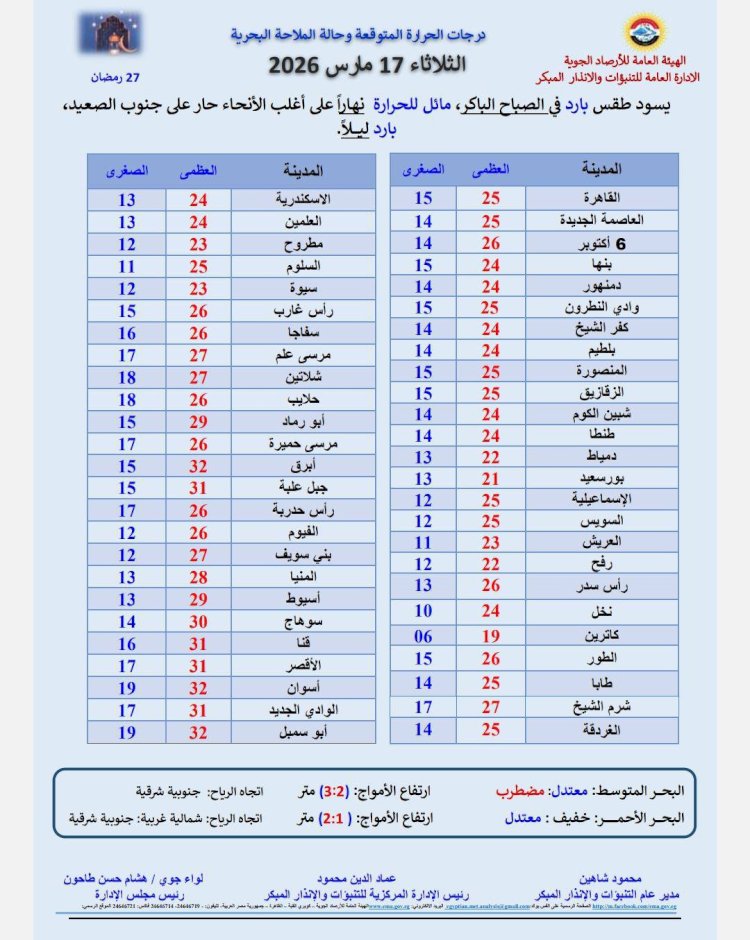 درجات الحرارة اليوم الثلاثاء 17 مارس 2026:القاهرة العظمى 25 درجة والصغرى 15 درجة الإسكندرية العظمى 24 درجة والصغرى 13 درجة. مطروح العظمى 23 درجة والصغرى 13 درجة. سوهاج العظمى 30 درجة والصغرى 14 درجات. قنا العظمى 31 درجة والصغرى 16 درجة فى أسوان العظمى 32 درجة والصغرى 19 درجة