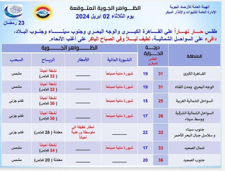 وبالنسبة لدرجات الحرارة اليوم الثلاثاء 2 إبريل 2024: القاهرة العظمى 31 درجة والصغرى 19، والإسكندرية العظمى 24 والصغرى 15، ومطروح العظمى 23 درجة والصغرى 14، وسوهاج العظمى 34 درجة والصغرى 18، وقنا العظمى 35 درجة والصغرى 18، وأسوان العظمى 36 درجة والصغرى 20.
