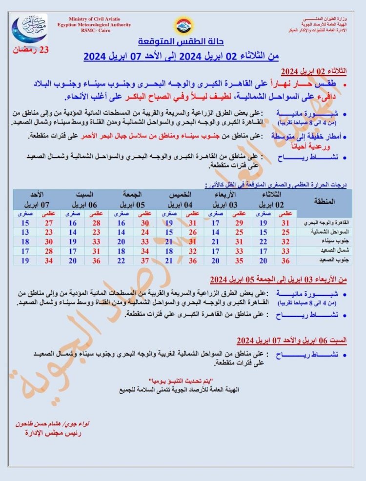 أيضا تتوقع هيئة الأرصاد الجوية أن يشهد اليوم نشاط رياح أحيانا على مناطق من القاهرة الكبرى والوجه البحرى ومدن القناة والسواحل الشمالية الغربية والسواحل الشمالية الشرقية ووسط سيناء.