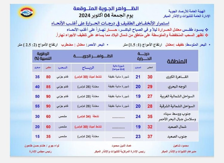 قالت هيئة الأرصاد الجوية إنها تتوقع أن يشهد اليوم الجمعة استمرار الانخفاض الطفيف فى درجات الحرارة ، ليسود طقس معتدل فى الصباح الباكر، حار نهاراً على أغلب الأنحاء، معتدل الحرارة ليلًا وفى الصباح الباكر.