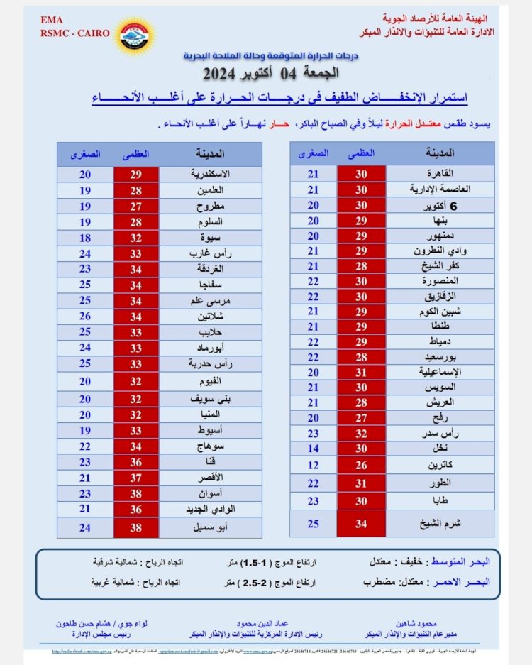 درجات الحرارة المتوقعة اليوم الجمعة 4 أكتوبر 2024: القاهرة العظمى 30 درجة والصغرى 21، والإسكندرية العظمى 29 والصغرى 20، ومطروح العظمى 27 درجة والصغرى 19، وسوهاج العظمى 34 درجة، والصغرى 22، وقنا العظمى 36 درجة والصغرى 23، وأسوان العظمى 38 درجة والصغرى 23.