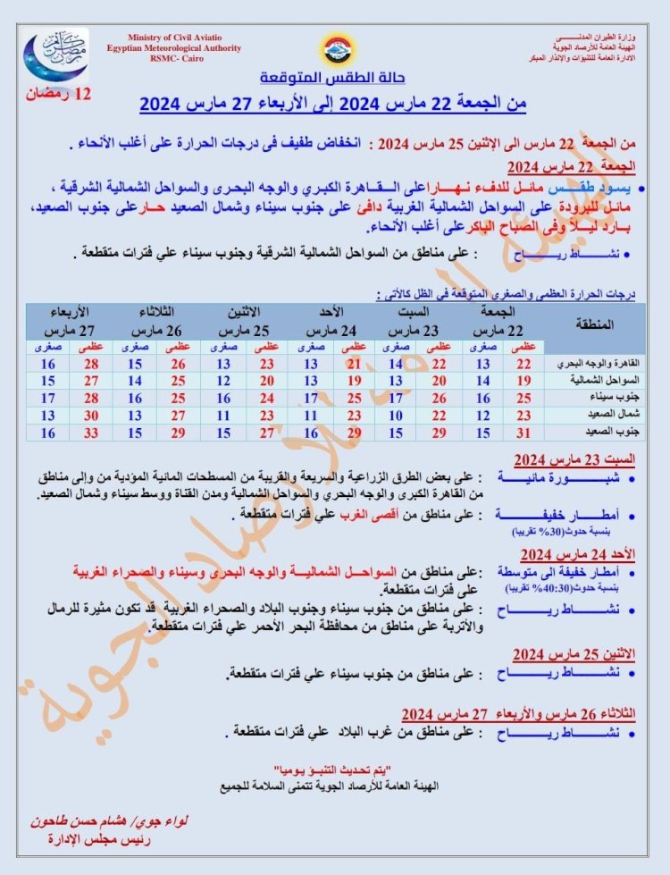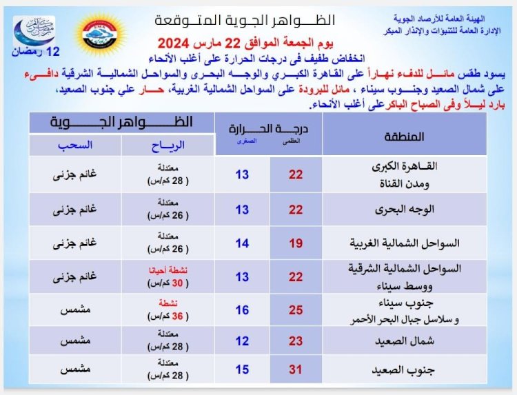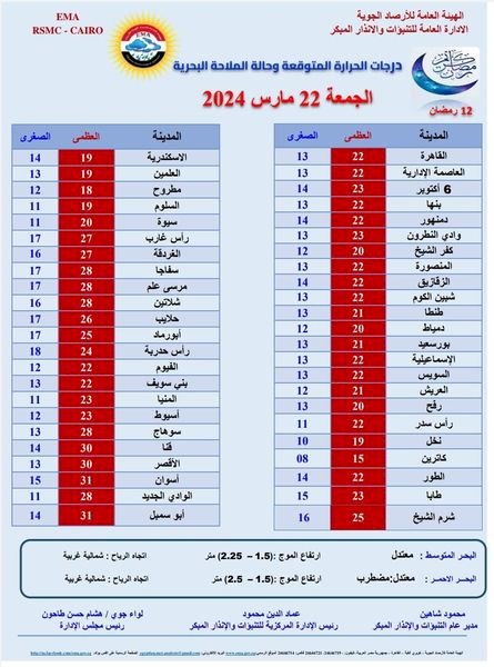 وبالنسبة لدرجات الحرارة اليوم الجمعة22 مارس 2024: القاهرة العظمى 22 درجة والصغرى 13، والإسكندرية العظمى 19 والصغرى 14، ومطروح العظمى 18 درجة والصغرى 12، وسوهاج العظمى 28 درجة والصغرى 13، وقنا العظمى 30 درجة والصغرى 14، وأسوان العظمى 31 درجة والصغرى 15.