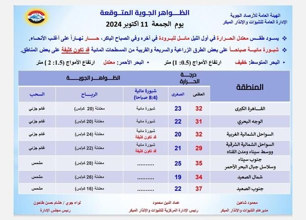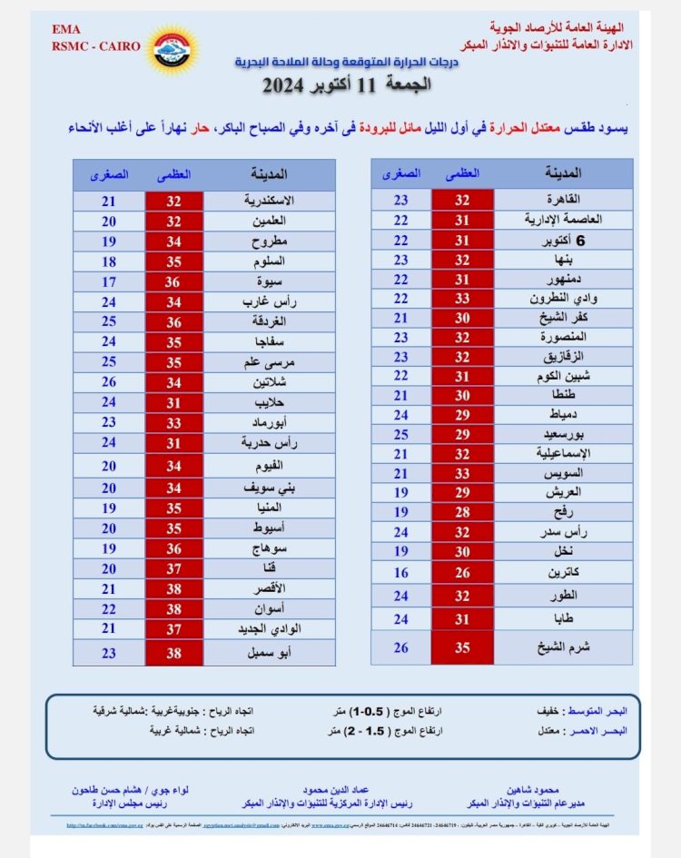 درجات الحرارة المتوقعة اليوم الجمعة 11 أكتوبر 2024: القاهرة العظمى 32 درجة والصغرى 23، والإسكندرية العظمى 32 والصغرى 21، ومطروح العظمى 34 درجة والصغرى 19، وسوهاج العظمى 36 درجة، والصغرى 19، وقنا العظمى 37 درجة والصغرى 20، وأسوان العظمى 38 درجة والصغرى 22 درجة.