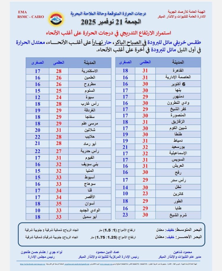 درجات الحرارة اليوم الجمعة 21 نوفمبر 2025 :القاهرة العظمى 31 درجة والصغرى 18 درجة. الإسكندرية العظمى 28 درجة والصغرى 17 درجة. مطروح العظمى 26 درجة والصغرى 16 درجة. سوهاج العظمى 33 درجة والصغرى 16 درجة. قنا العظمى 34 درجة والصغرى 17 درجة. فى أسوان العظمى 35 درجة والصغرى 19 درجة.