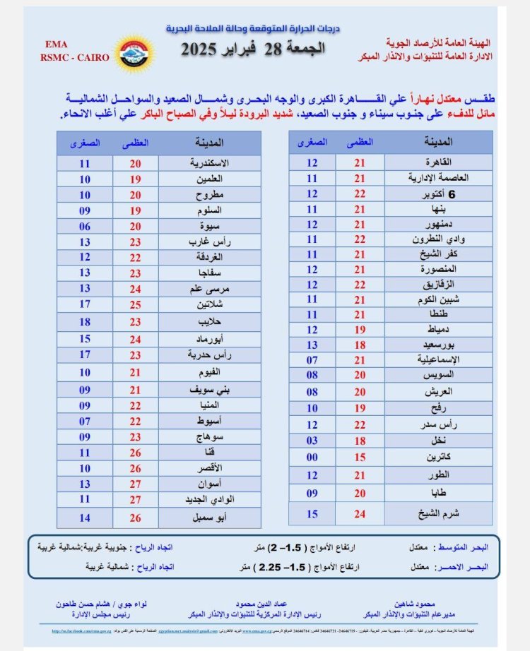 درجات الحرارة اليوم الجمعة 28 فبراير 2025 القاهرة العظمى 21 درجة والصغرى 12، والإسكندرية العظمى 20 والصغرى 11، ومطروح العظمى 20 درجة والصغرى 10، وسوهاج العظمى 23 درجة، والصغرى 09، وقنا العظمى 26 درجة والصغرى 11، وأسوان العظمى 27 درجة والصغرى 13 درجة.