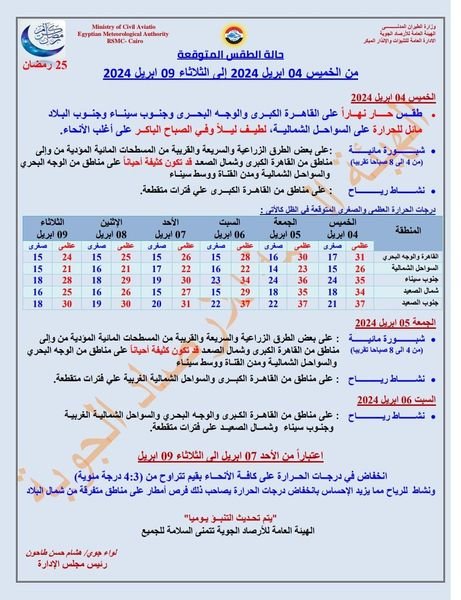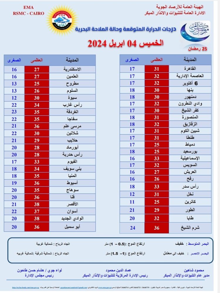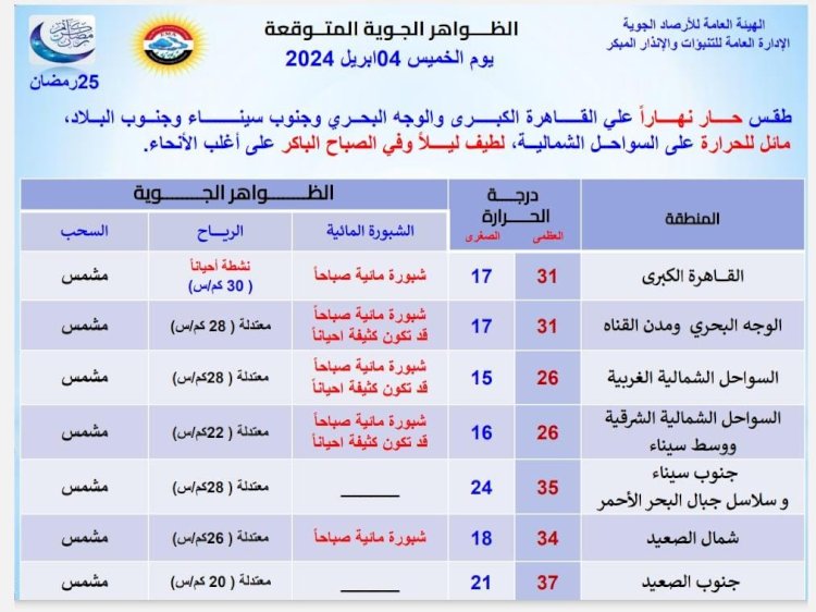 وبالنسبة لدرجات الحرارة اليوم الخميس 4 إبريل 2024: القاهرة العظمى 31 درجة والصغرى 17، والإسكندرية العظمى 27 والصغرى 16، ومطروح العظمى 25 درجة والصغرى 13، وسوهاج العظمى 35 درجة والصغرى 20، وقنا العظمى 36 درجة والصغرى 20، وأسوان العظمى 37 درجة والصغرى 22.